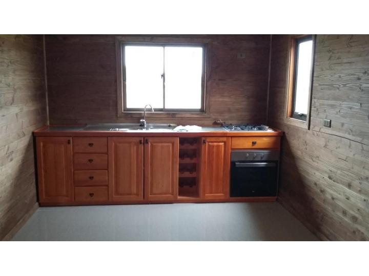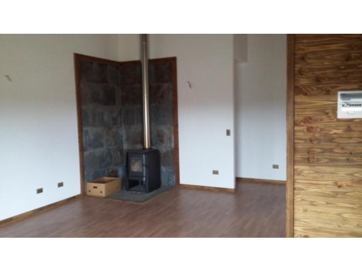 Living y comedor con vigas a la vista, 3 dormitorios con sus closets, 2 baños, cocina con mobiliario, encimera y horno, balón gas 45 kgs, estufa combustión lenta instalada, estacionamiento techado, bodega.