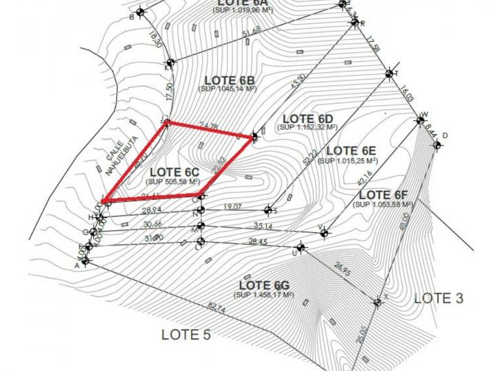 Los terrenos corresponden a 2 lotes diferentes, uno con una superficie de 505,58 metros cuadrados en forma rectangular, y el otro es de 1.152,32 metros cuadrados, ambos con pendiente.
